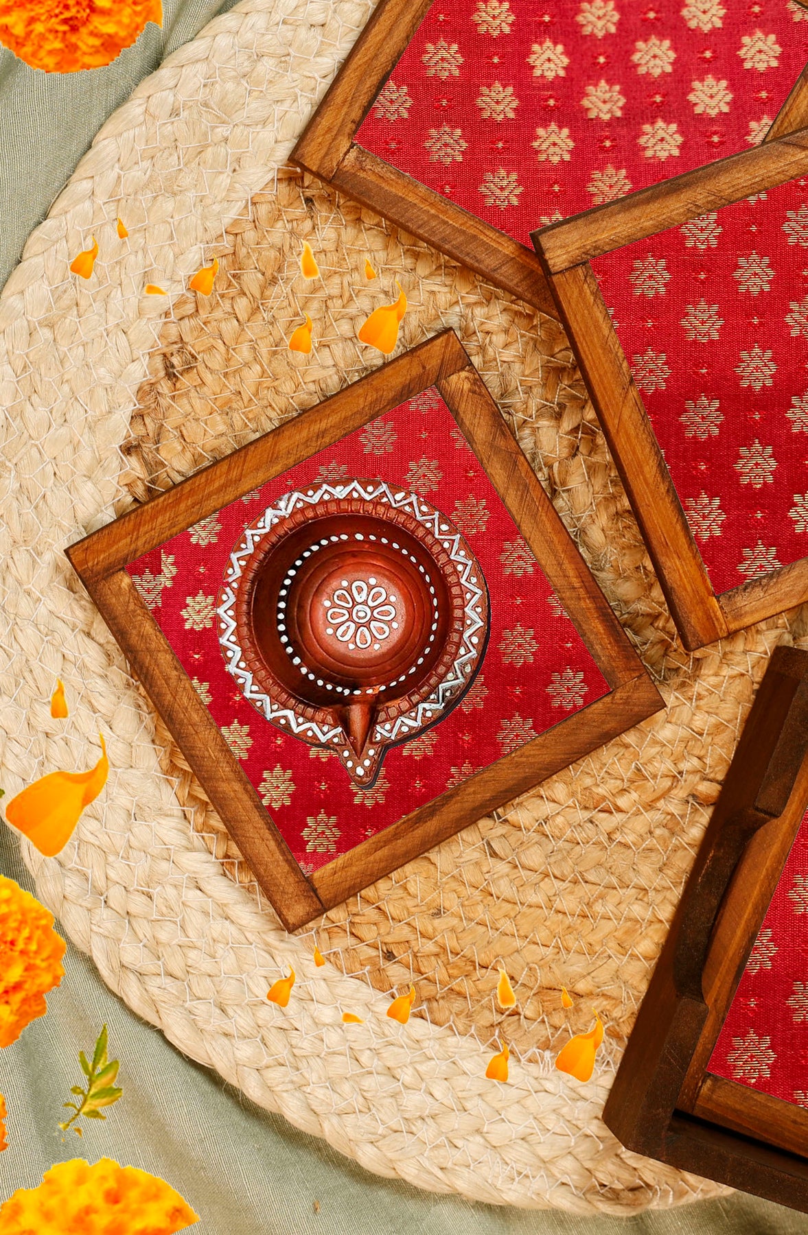 Add a touch of timeless grace to your table setting with our Blended Silk Jacquard Coaster Set. Crafted from exquisite Banarasi-inspired woven fabric, these coasters showcase intricate gold motifs on a rich red base, a nod to India’s royal textile traditions. Framed in fine wood, they merge elegance with utility, making them perfect for festive dining, gifting, or simply elevating your everyday décor.