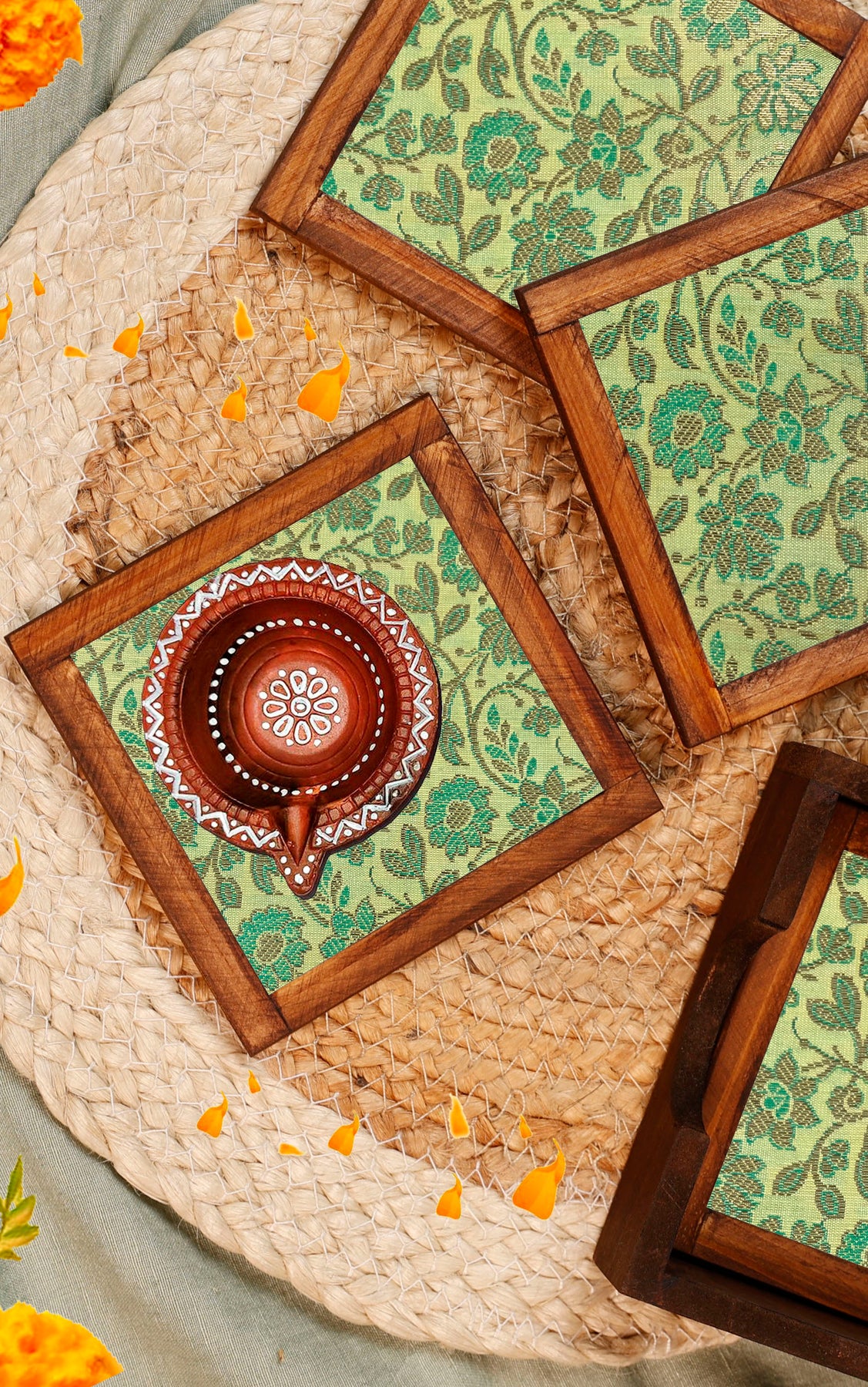Green Harmony – Silk Blend Brocade Coasters (Set of 4) - with Coaster Holder